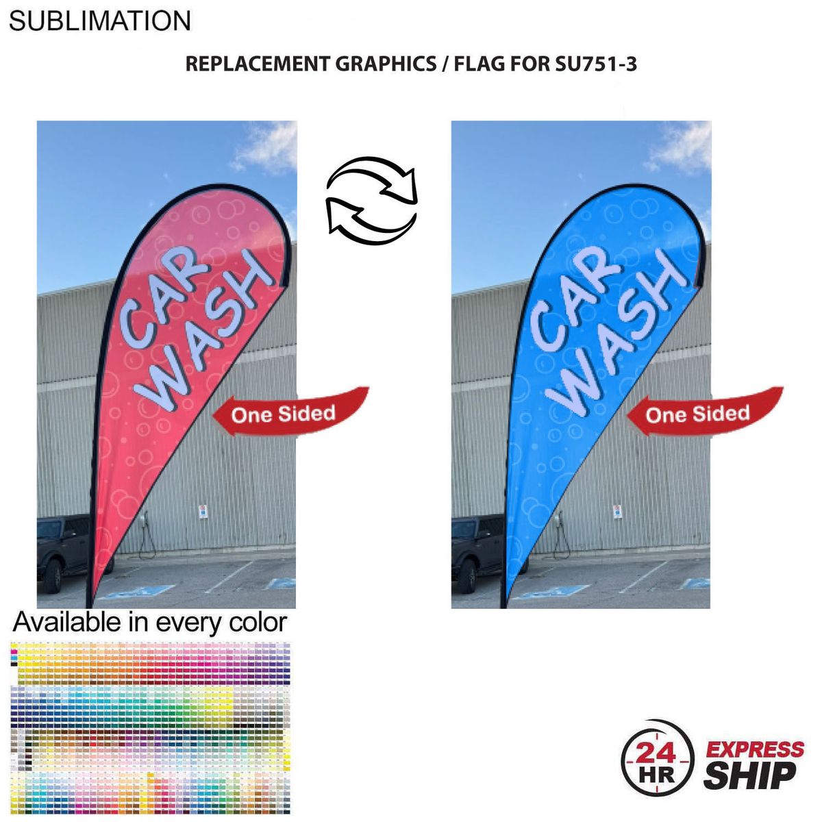 Out with the old, in with the new with replacement graphics. Replacing Graphics takes seconds and is convenient. one-sided graphic cover is viewable from the front of the display for the visibility. Hardware and carry bag not included. Fabric Flag Includes Full color, High resolution Sublimation printing on 1 side. Graphics are printed on a premium 110 gsm polyester fabric. Usage: SALE sign, Grand Opening Sign, Warehouse Sales, Business location, Front of Building , Attracting attention, Pop up Stores, Events, Offices, Open House. Price includes full color graphics on One Side. Max Imprint: 40" x 94"L.