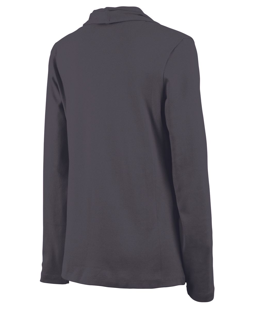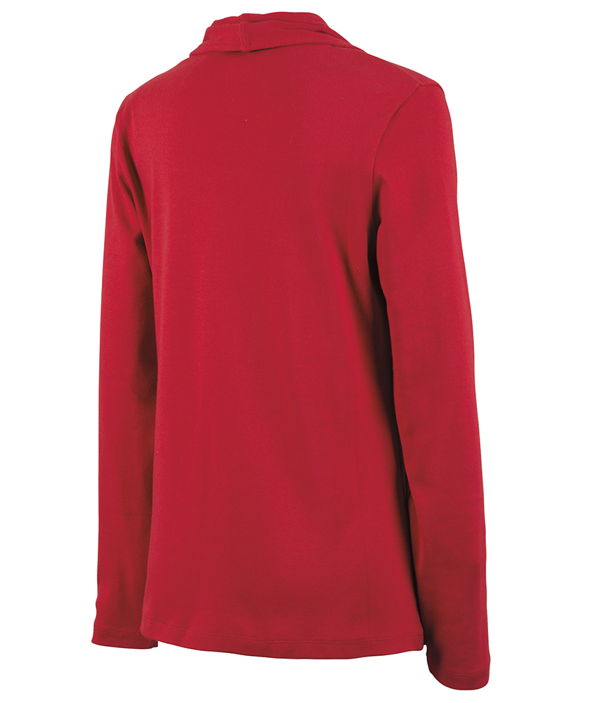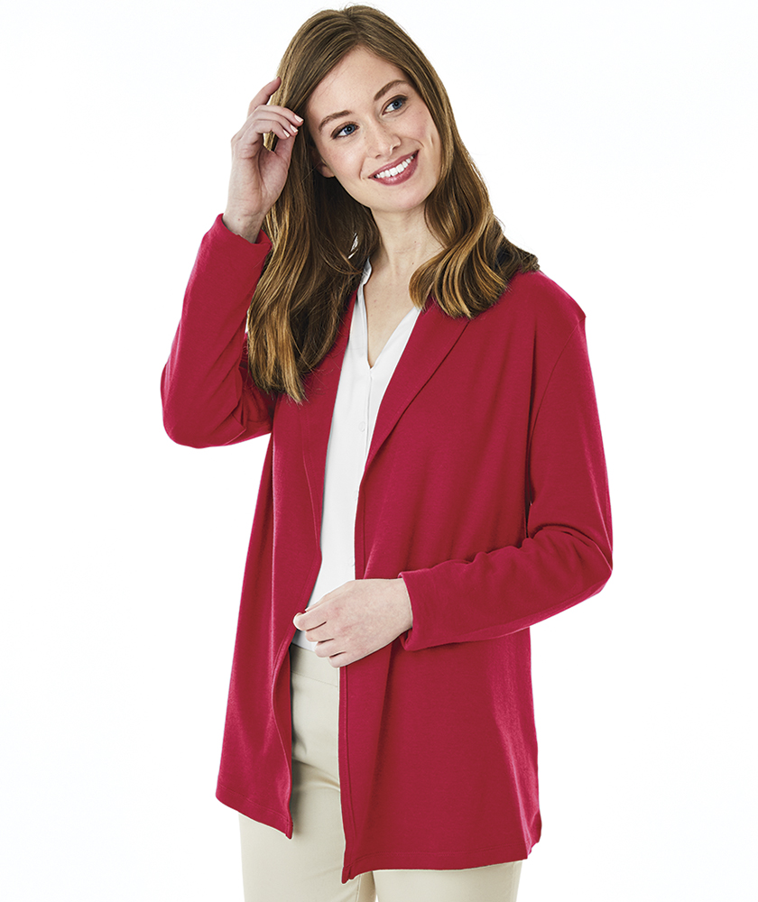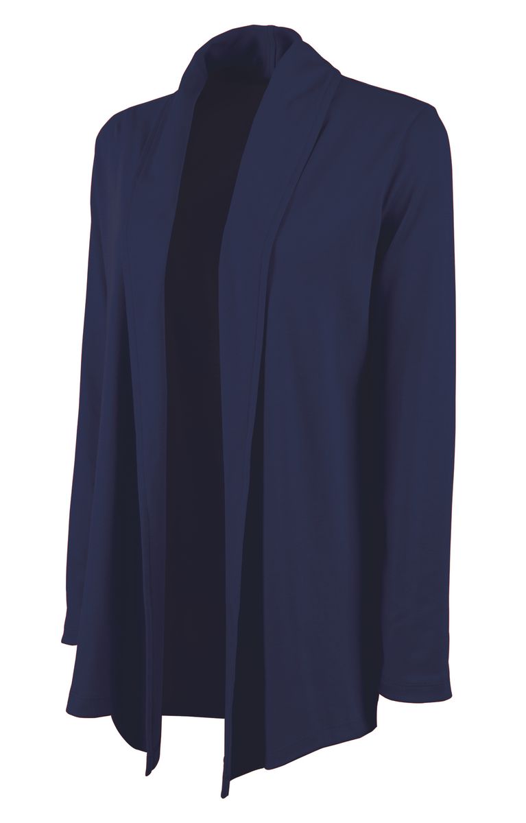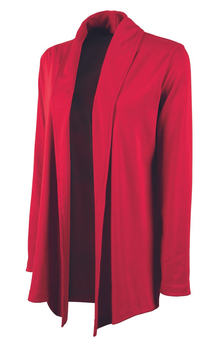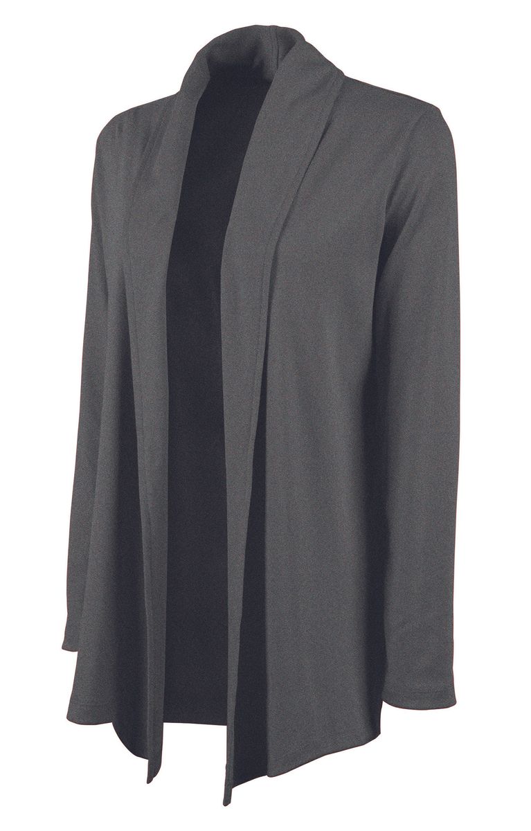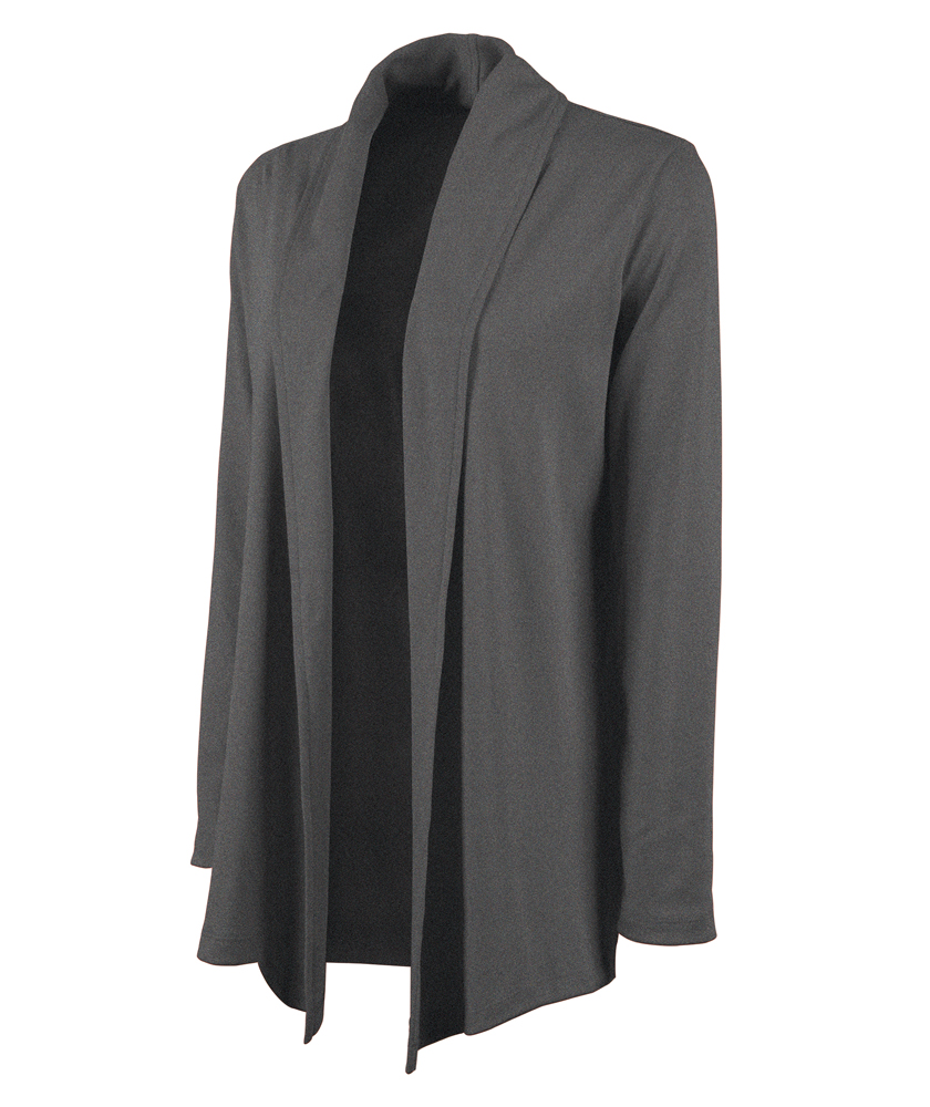 The Women's Cardigan Wrap features 100% soft Supima® cotton (5.60 oz./yd²), offering exceptional softness and a graceful drape. It includes a shawl-style collar, tagless neck label for comfort, and an asymmetrical front hem for a flattering appearance. Length extends to mid-hip with double-needle stitching for durability. (Dark charcoal heather is 100% cotton due to heathered coloring).