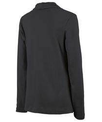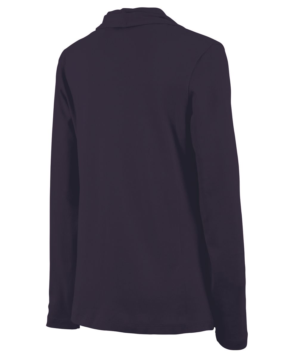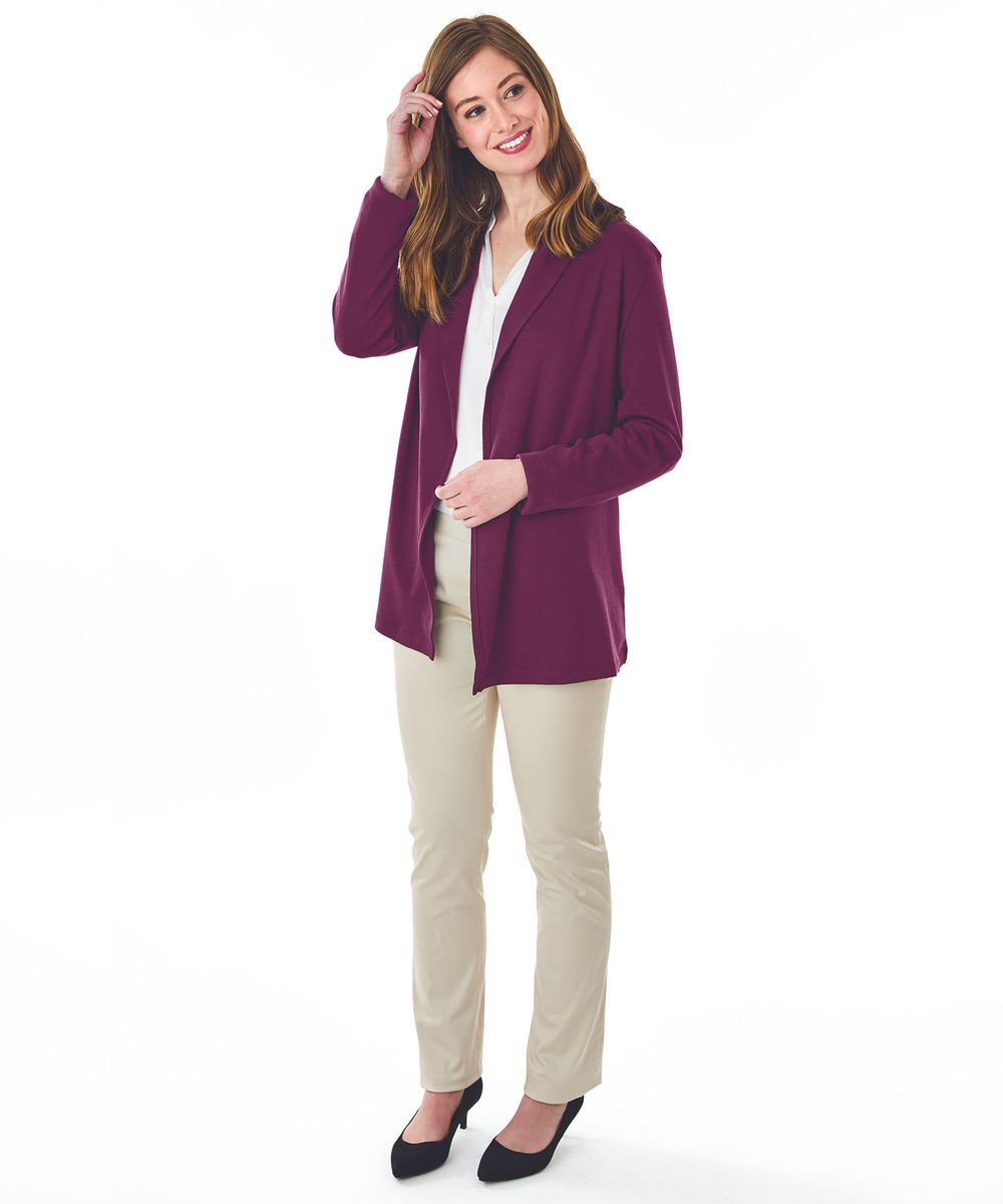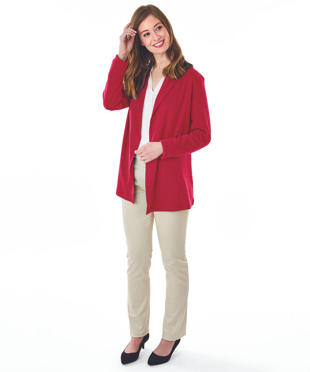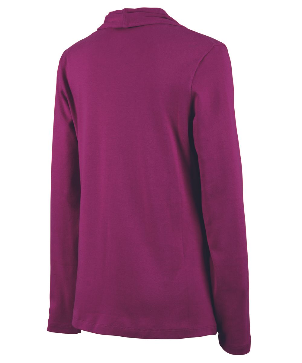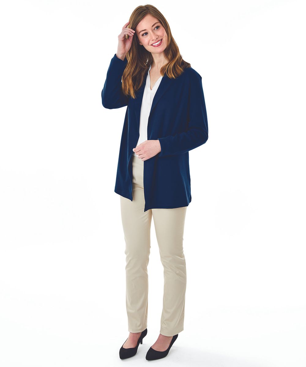 The Women's Cardigan Wrap features 100% soft Supima® cotton (5.60 oz./yd²), offering exceptional softness and a graceful drape. It includes a shawl-style collar, tagless neck label for comfort, and an asymmetrical front hem for a flattering appearance. Length extends to mid-hip with double-needle stitching for durability. (Dark charcoal heather is 100% cotton due to heathered coloring).