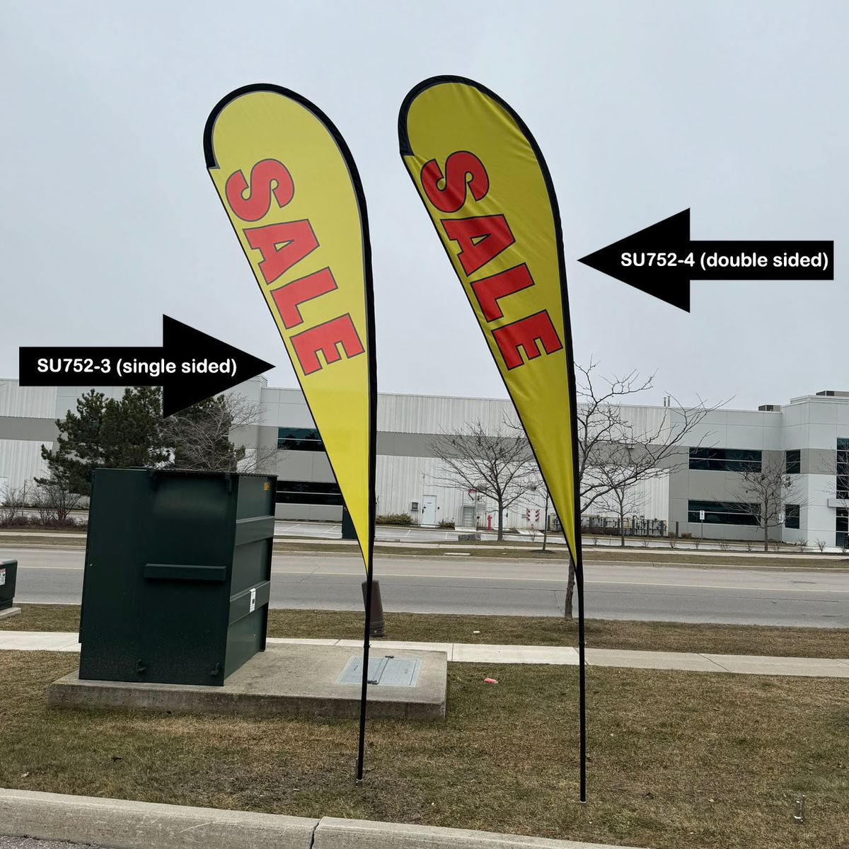 Fabric Tear Drop flags are a highly effective advertising tool for businesses looking to increase their visibility and attract attention at events or storefronts. Use this Fabric Tear Drop Flag Kit Outdoors on grass / soil using the spike base which is included in the kit. It comes with Aviation grade fiberglass Carbon Composite poles. Fabric Flag Includes Full color, High resolution Sublimation printing on Both sides. Graphics are printed on a premium 110 gsm polyester fabric with a grey blocker in between the 2 sides. Usage: SALE sign, Grand Opening Sign, Warehouse Sales, Business location, Front of Building , Attracting attention, Pop up Stores, Events, Offices, Open House. Price includes full color graphics on Two Sides. Max Imprint: 39” x 117”L (Front & Back).