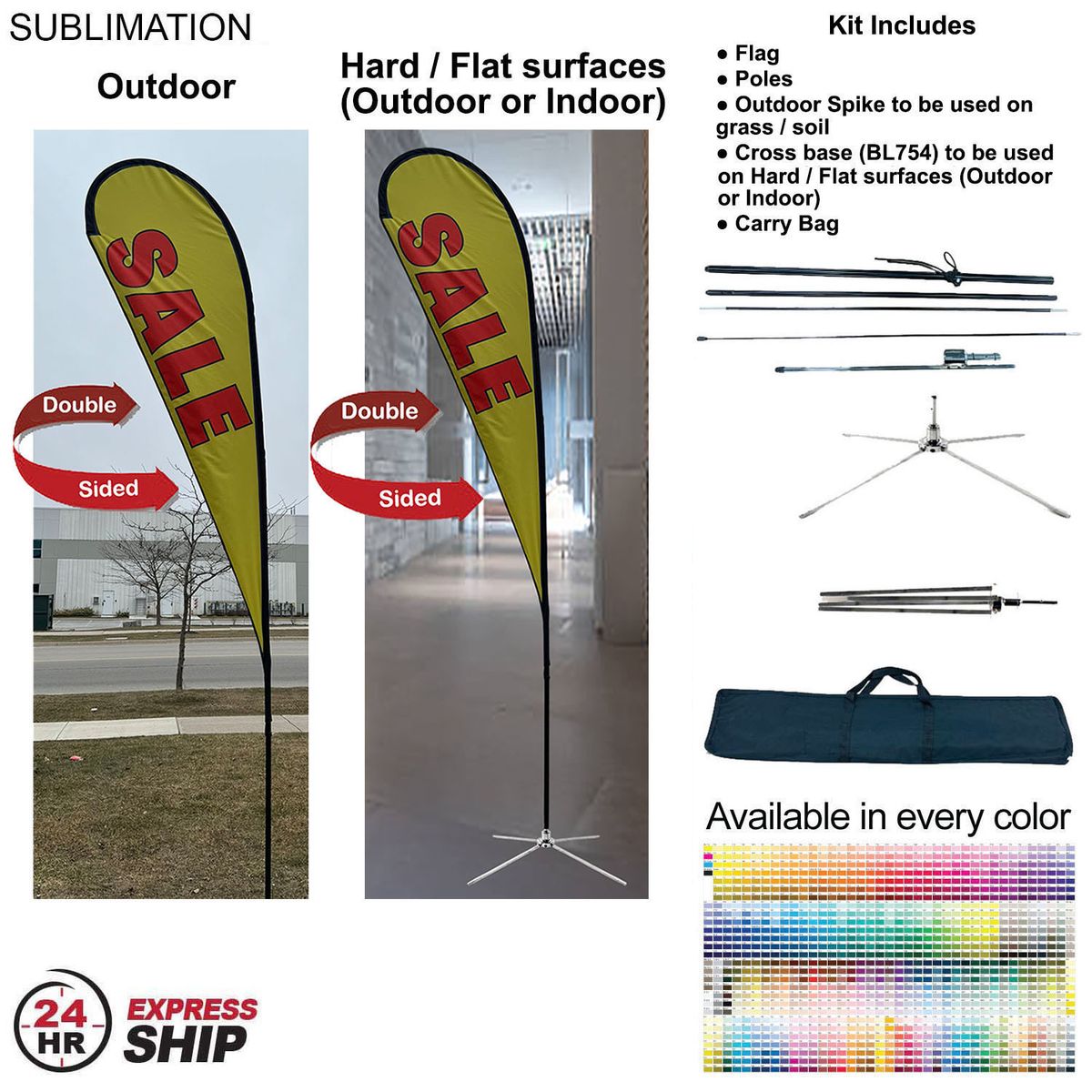 - 13.5' Large Tear Drop Flag Kit, Double Sided, Spike base for outdoor use, Cross base for indoor / outdoor use on hard suface and Carry Bag are Included. This Kit can be used outdoors and indoors. Fabric Tear Drop Flag includes Full Color Graphics double Sided (2 sided). There is a grey blocker in between the sides to avoid print shadowing.